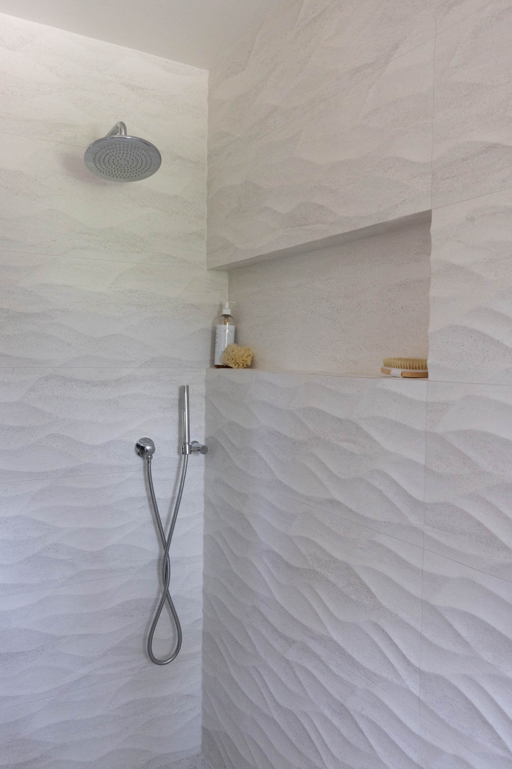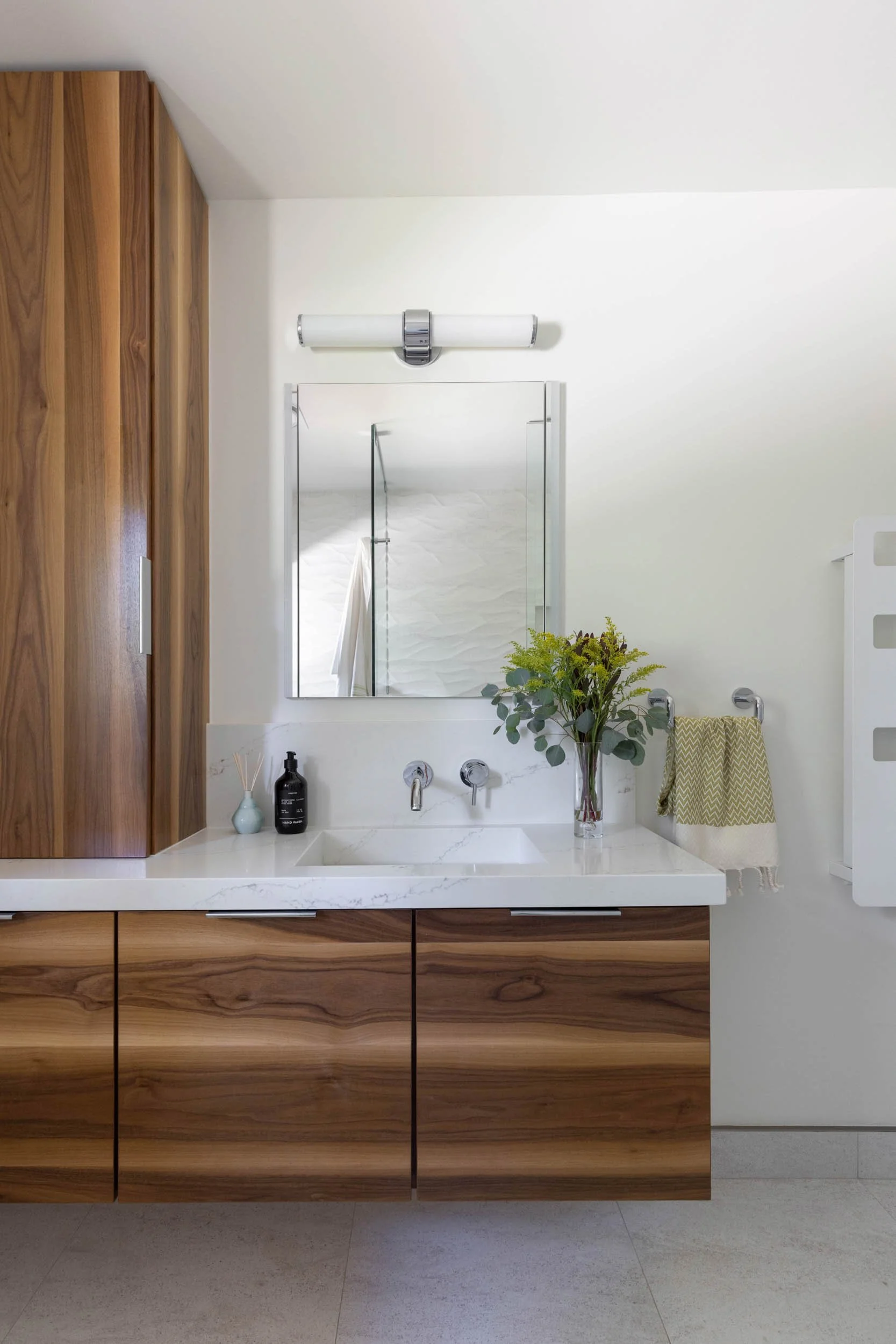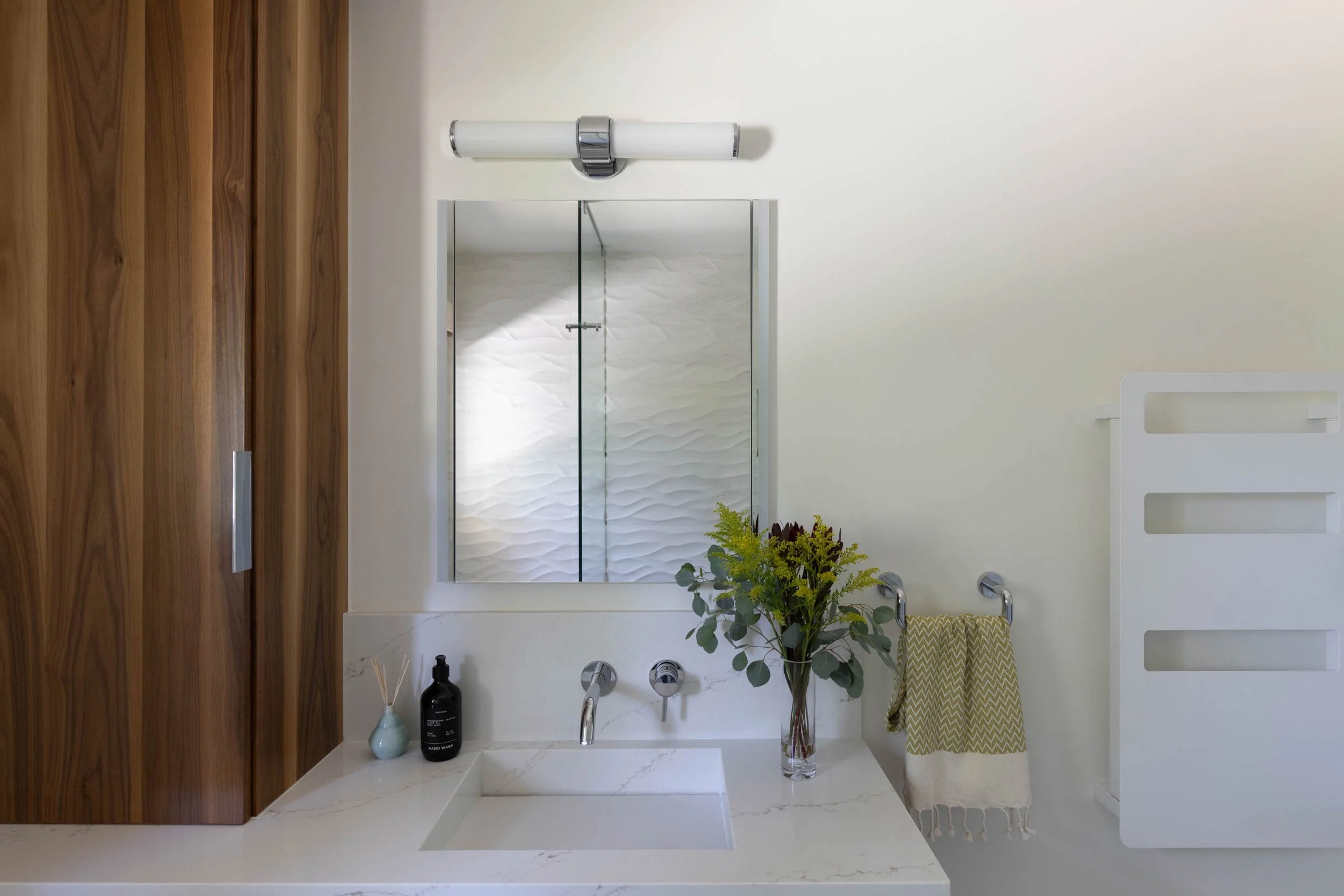 The guest bathroom was redesigned as part of the same renovation — a walk-in shower with custom niche, walnut vanity, and an infinity sink that brings the same considered material language into a smaller space. Functional for guests, resolved in its own right.