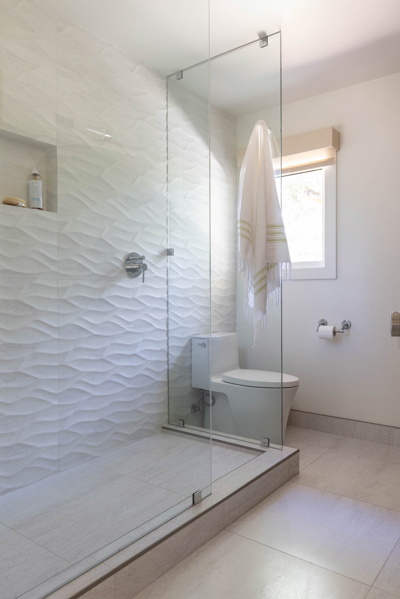 The biophilic approach here went well beyond materials and light — it shaped the layout itself. The shower was positioned to receive the north-facing windows' diffused, consistent daylight. A custom curved glass shower enclosure was designed not only to maximize usable space but to echo the curved cabinetry throughout, creating a room that reads as a single composed whole.